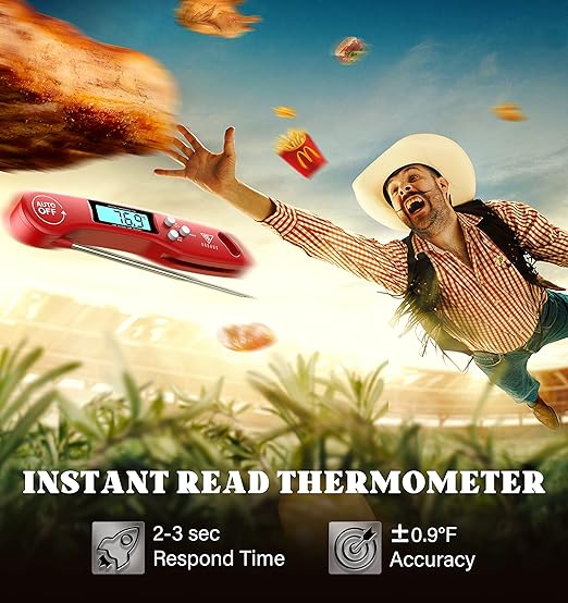 - CLEAR AND REVERSIBLE DISPLAY: You will get the clarity temperature with the bright and large LCD screen, also you can read the food temperature in the dark while grilling with backlit button! Or press for 3s to switch ℃/℉. And the Exclusive auto-rotating display rotates automatically depending on how the instant read food thermometer is held and enables you to read the numbers from any direction which is convenient for right or left-hand persons to use, letting you enjoy every step of cooking!