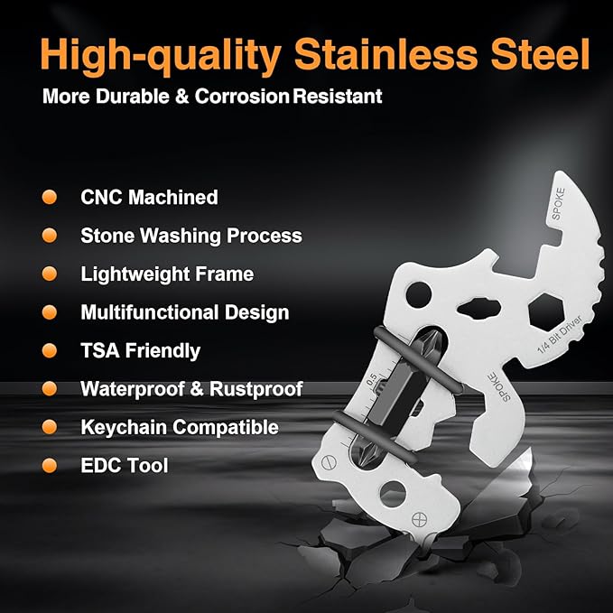 - 12-in-1 Tools: This pint-size multi-tool features Phillips & Flathead Screwdrivers, Lanyard Hole, Spoke & Hex Wrench, Bottle Opener, Ruler, Fire Starter, Survival Whistle, etc. for removing nails, measuring, bike repairing, etc