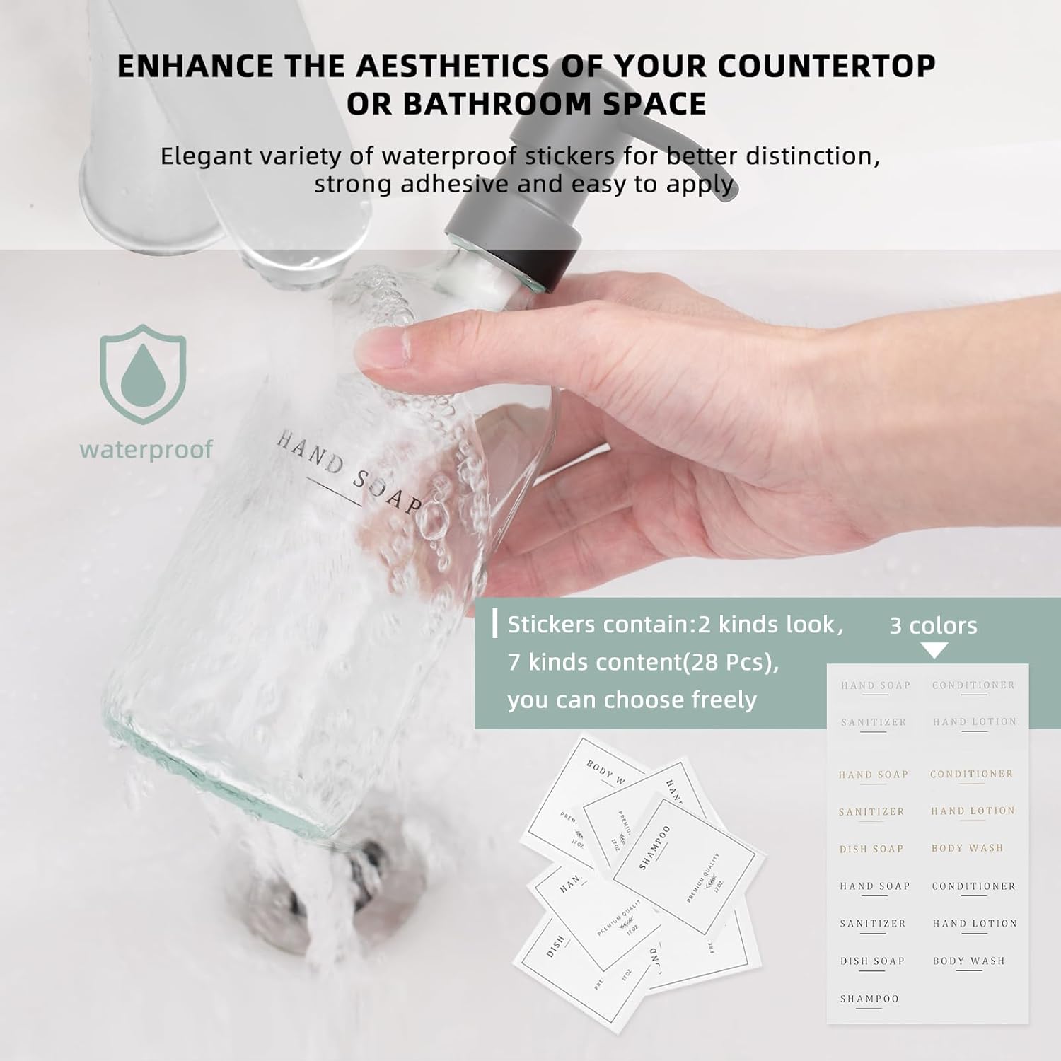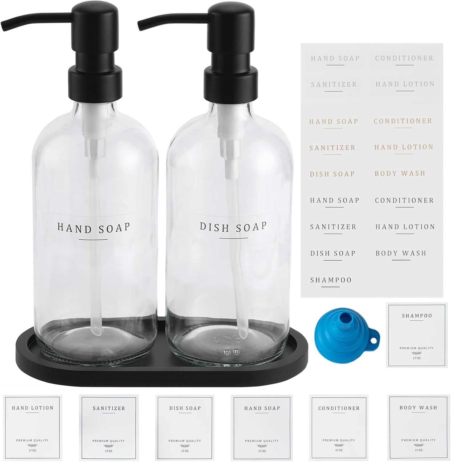 - A practical and aesthetically pleasing addition to your home: This soap dispenser set contains 2 reinforced hard glass bottles with sleek and stylish stainless steel pump heads for your liquid soap; hand soap, dish soap, hand lotion, body wash, shampoo, conditioner labels, 1 silicone funnel, 1 waterproof non-slip tray, this set has transformed mundane routines into moments of indulgence and style.