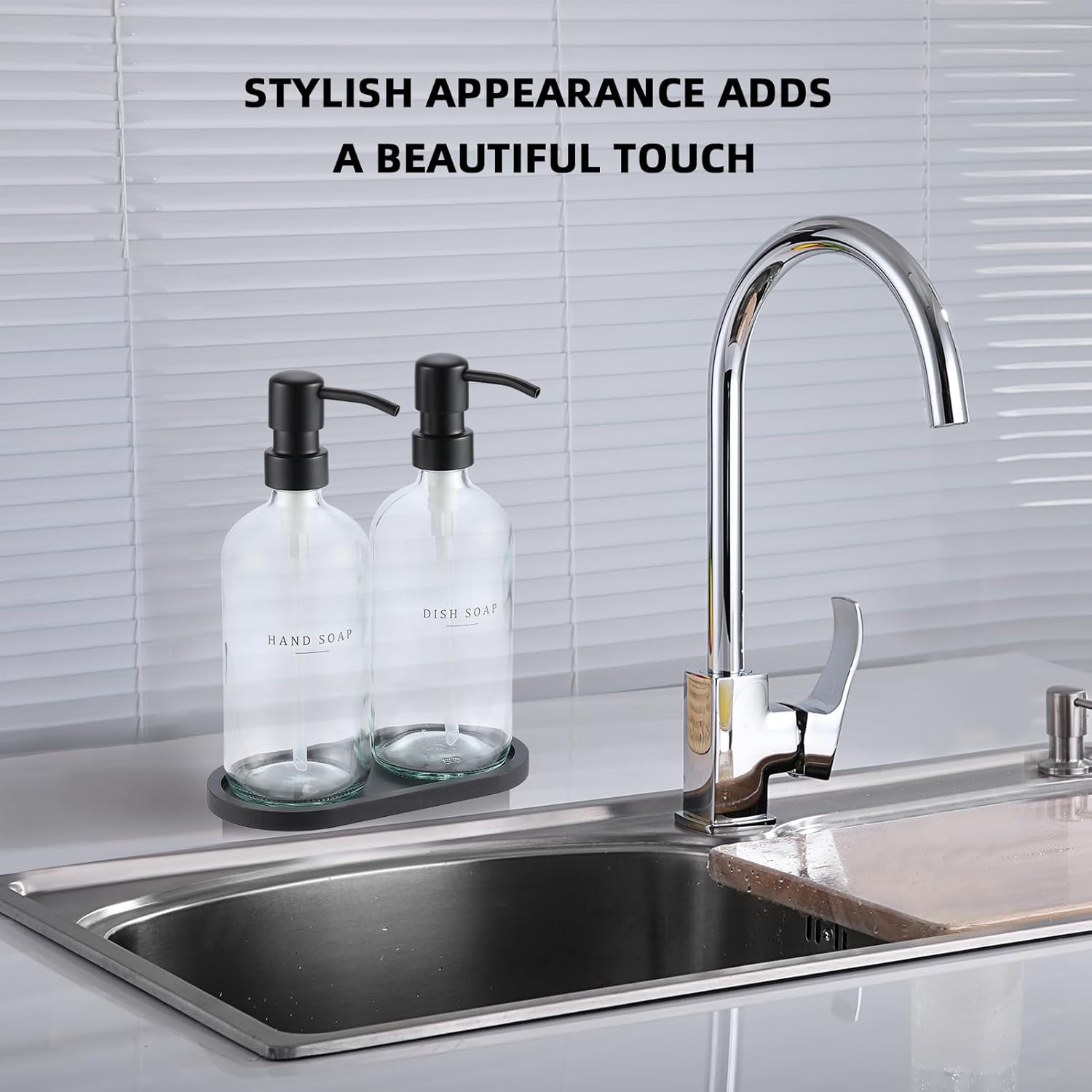 Glass Soap Dispenser - Dish Hand Soap Dispenser for Kitchen, Bathroom Soap Lotion Dispenser with 304 Rust Proof Pump, Tray, Clear Bottle/Black Pump