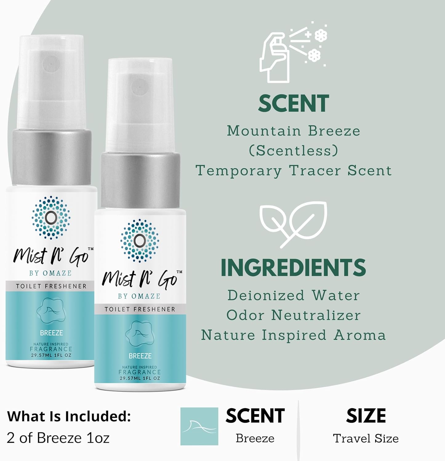 Mist N’ Go by Omaze Travel Bathroom Spray for Toilet Spray Odor Eliminator - Travel Toilet Spray for Bathroom Air Freshener Spray for Bathroom Deodorizer - Breeze Travel Size (1oz x2)