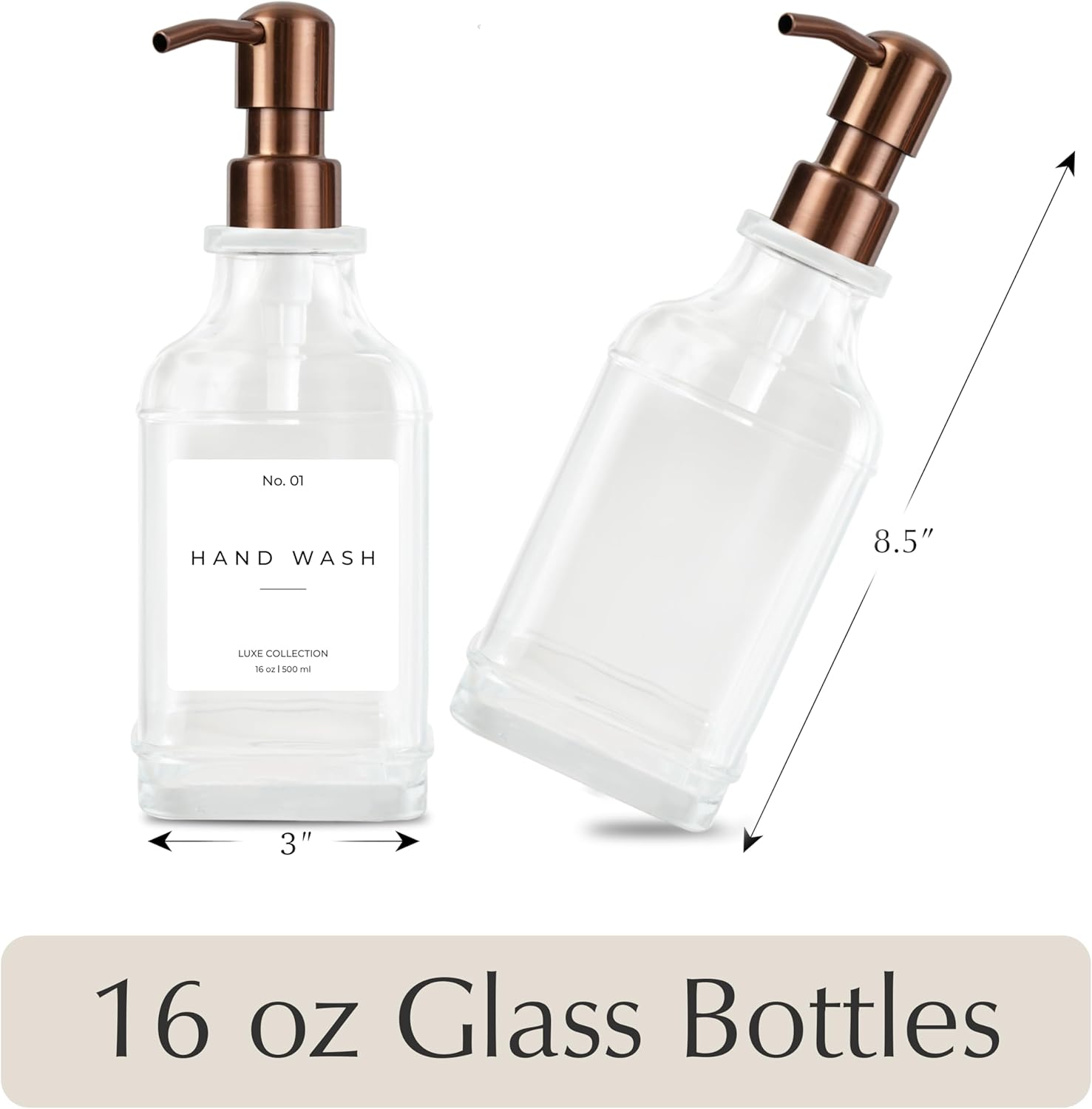 - β PREMIUM QUALITY THAT LASTS: Designed to complement any space, these 16 oz glass soap dispensers are perfect for hand soap, dish soap, lotion, or shampoo. Ideal for sinks in your kitchen, bathroom, laundry room, or guest bath. Unlike dispensers that peel or break down, our bottles are made from thick, durable glass that resists wear and looks elegant on any countertop.