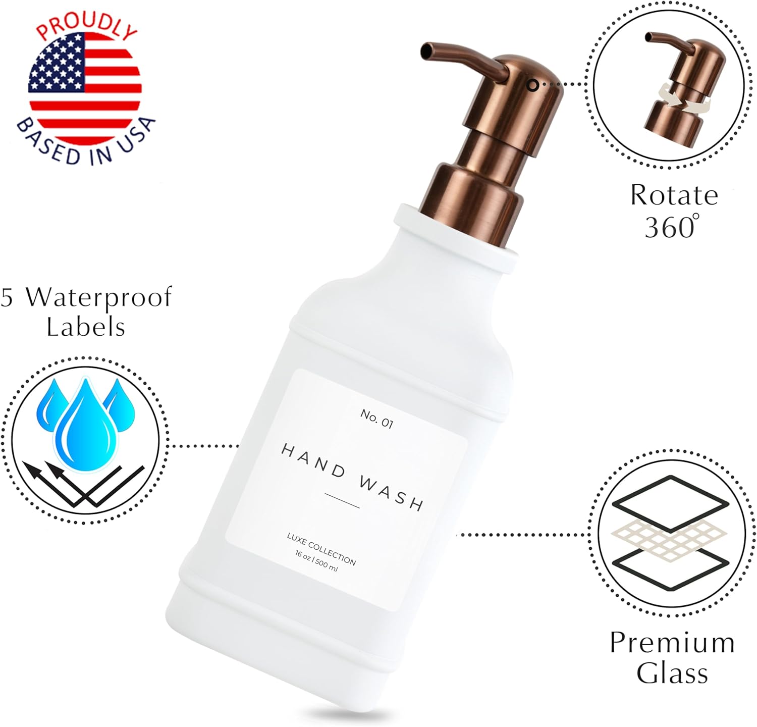 - β PREMIUM QUALITY THAT LASTS: Designed to complement any space, these 16 oz glass soap dispensers are perfect for hand soap, dish soap, lotion, or shampoo. Ideal for sinks in your kitchen, bathroom, laundry room, or guest bath. Unlike dispensers that peel or break down, our bottles are made from thick, durable glass that resists wear and looks elegant on any countertop.