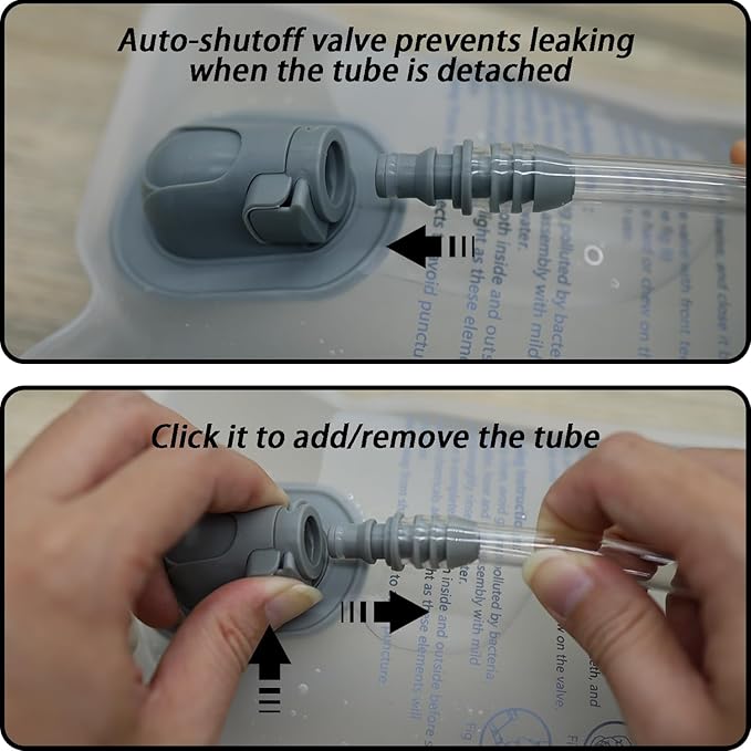 - UPGARDE LEAK PROOF&WHITE TUBES DESIGN: Soft yet durable mouthpiece with easily accessible ON/OFF valve prevents leakage. You can control the water flow by biting, First pull up on the drinking cap, gently bite the mouthpiece with your front teeth to have a sip and start drinking, push back to stop water flow. Quick-release tube is detachable. The hydration bladder will stay filled non-leaking. The bladder bags also has a dust cover to keep dirt out.