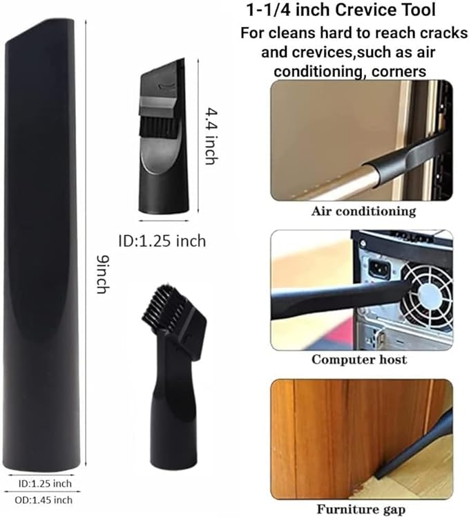 - 【What You Get】1.25" crevice tool, 1.25" Horse Hair Round Dust Brush , 1.25" utility nozzle with brush, 1.25" upholstery tool, 1.25" brush & nozzle combination tool, 1.25" Hardwood Floor Brush, 1 7/8" to 1 3/8" to 1 1/4 to 1" vacuum adapter.