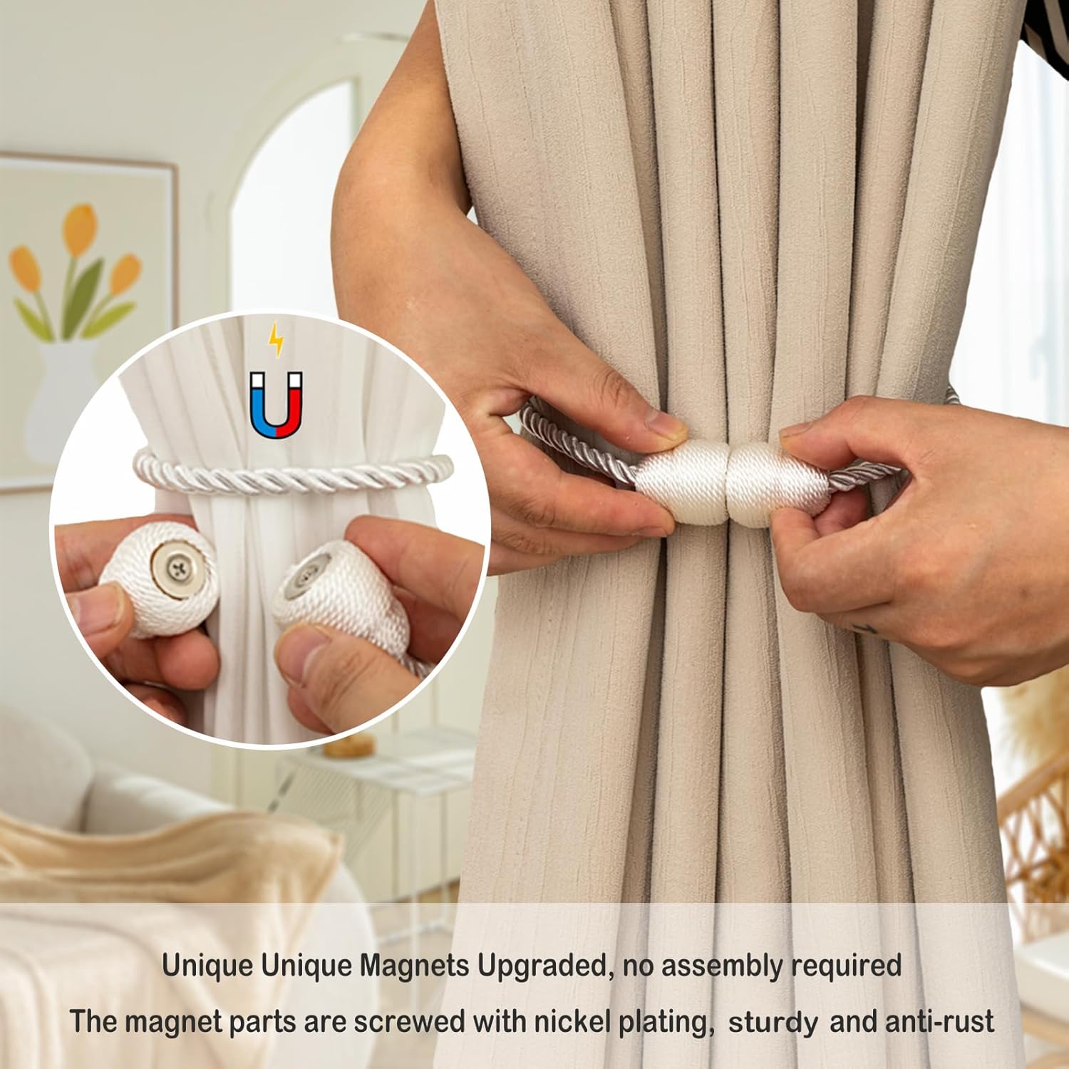 Magnetic Curtain Tiebacks - Rope Tie Backs for Curtains & Drapes - Decorative Window Holdbacks (6 Pack, White)