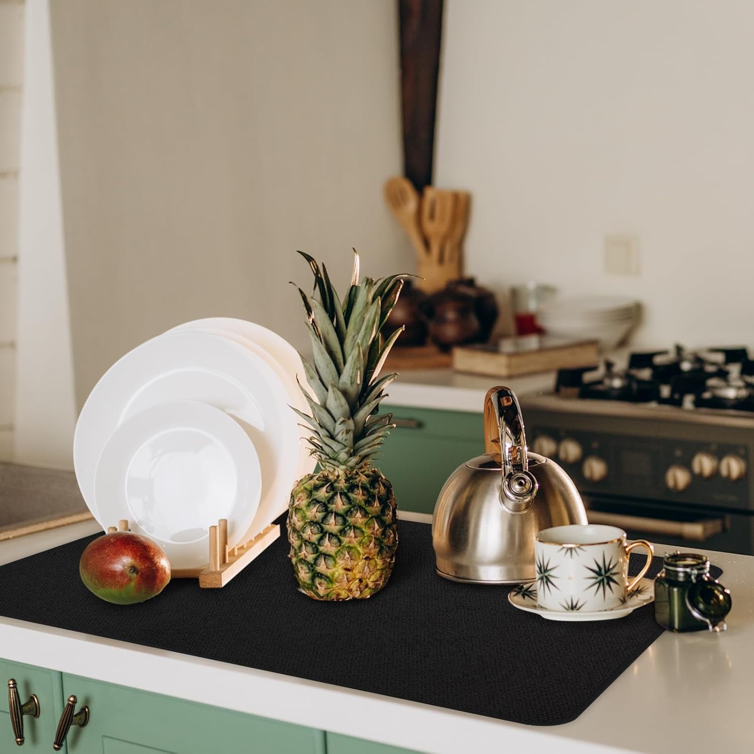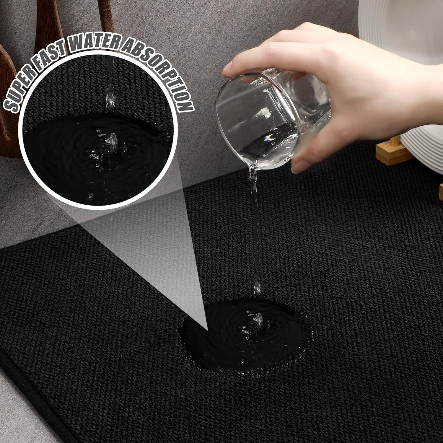 - Reliable Material and Attractive Design: get the ideal balance of functionality and style with our kitchen drying mats for dishes; Made from microfiber, these mats exhibit impressive water absorbent property, ensuring a dry, clean countertop; Their pleasing black color will effortlessly blend with most kitchen interior, enhancing its aesthetics
