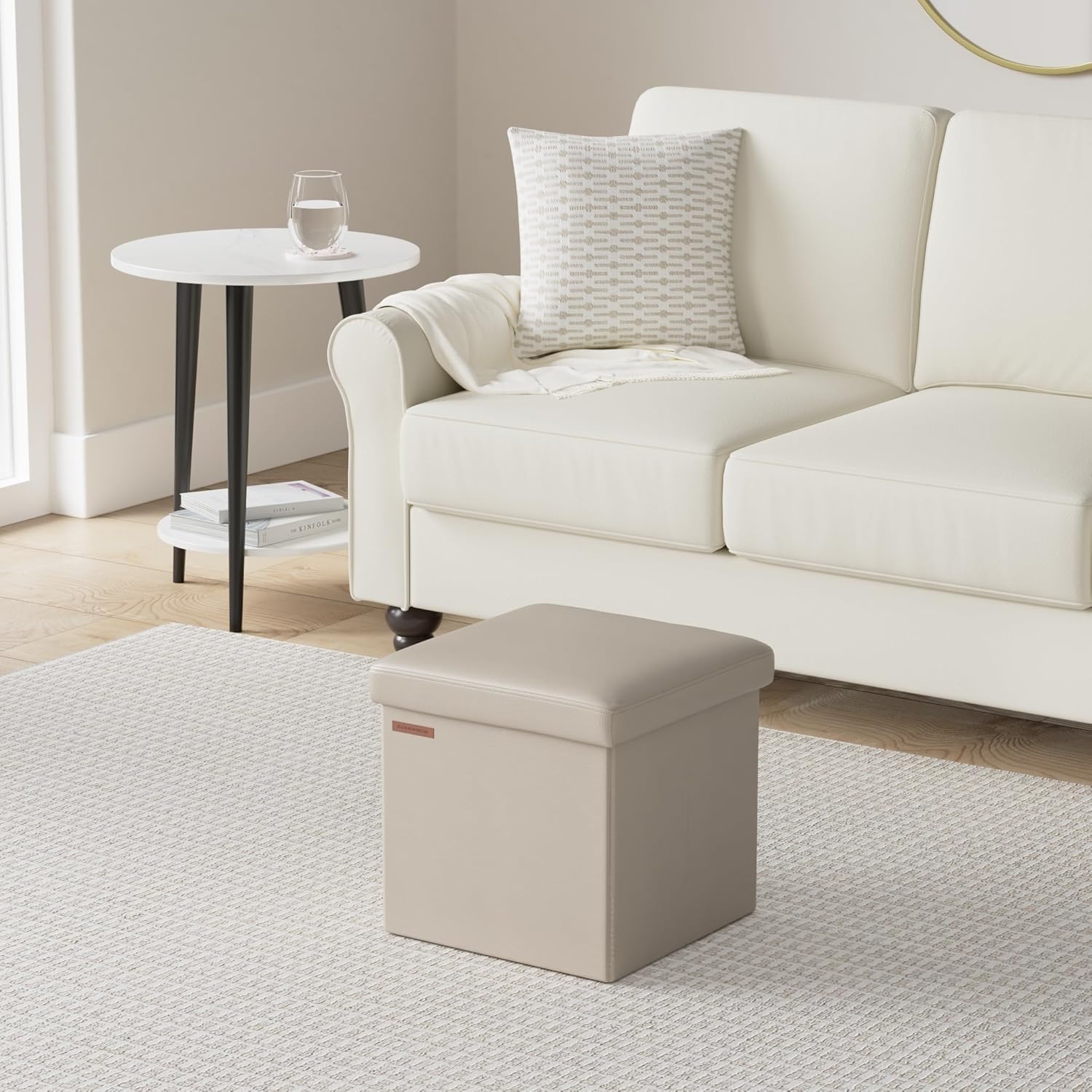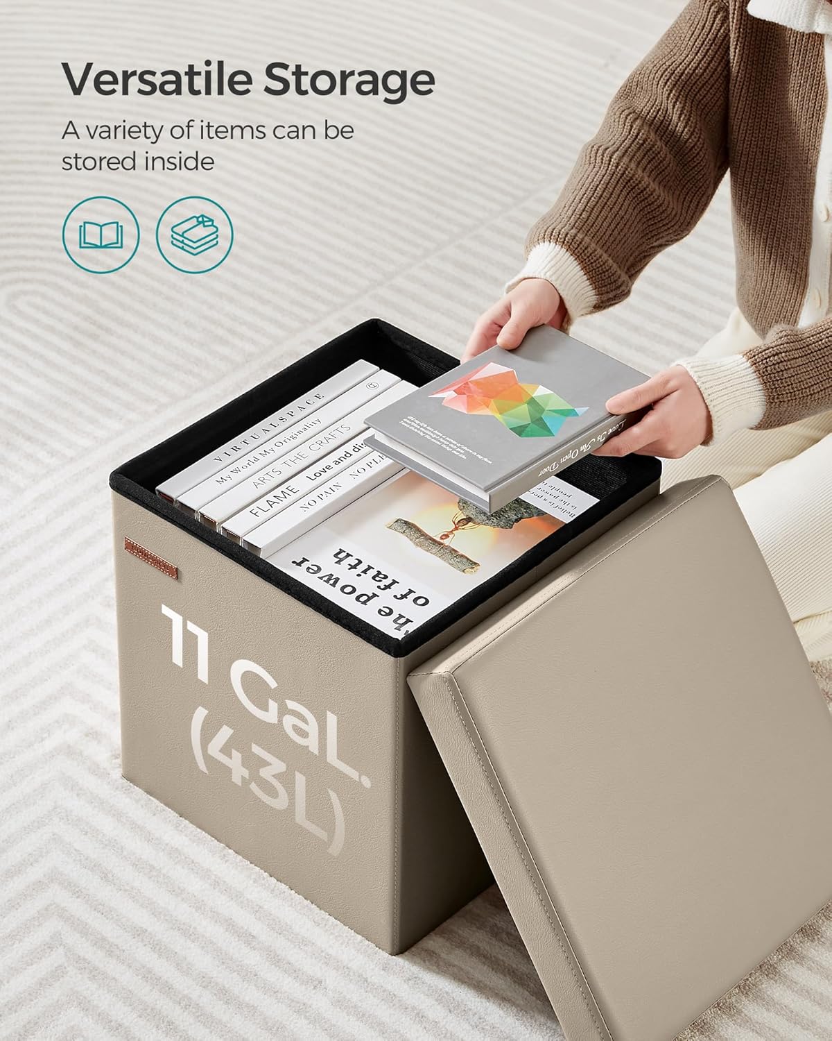 SONGMICS Mazie Collection - 15 Inches Ottoman with Storage, Footstool, Storage Ottoman, Load 660 lb, for Dorm, Living Room, Bedroom, Synthetic Leather, Camel Brown ULSF010K03