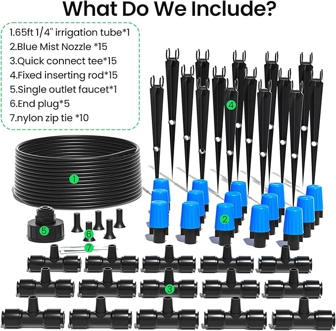 - [Advanced Misting Watering System]The MIXC Misting Watering System kit offers top-notch features for convenient and efficient plant care. Each kit includes:100ft 1/4'' irrigation tube*1,Blue Mist Nozzle *15,Quick connector tee*15,Fixed inserting rod*15,Single outlet faucet*1,End plug*5,Nylon zip tie *10