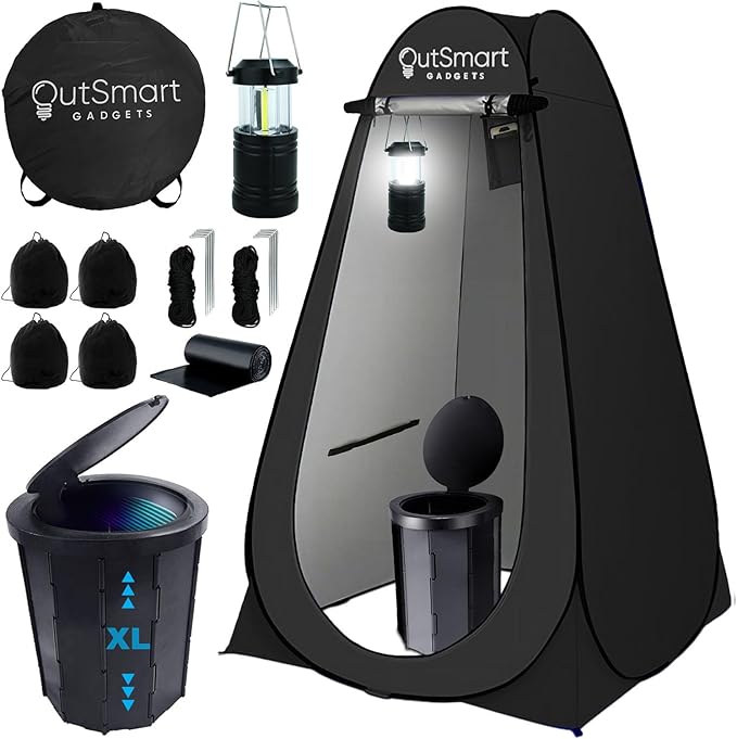 - 【All in One Portable Outside Toilet Set】Convenient for both new and professional campers of all ages, this toilet camping set includes a durable foldable toilet with a secure lid latch, 6ft 2in privacy tent, LED camping lantern (AA batteries not included), 8 ropes and stakes (4 extra included for backup), toilet trash bags, and 2 carry bags.