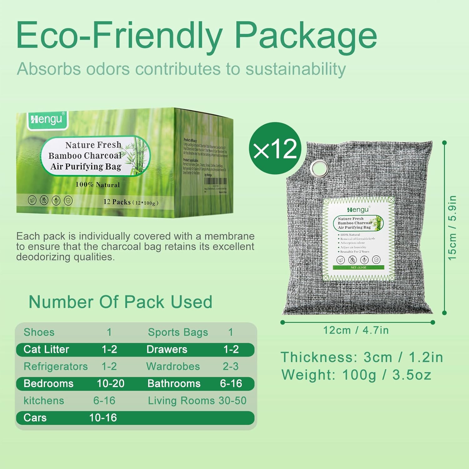 - 【12-Pack Activated Charcoal Odor Absorber】Our activated charcoal odor absorber has richer porous structure and organic composition,which could remove & adsorb unpleasant odors,Makes your home fresh.You can hang them with the rope anywhere in your house. 3.5 ounce /100g each bag, 4.7" x 5.9".
