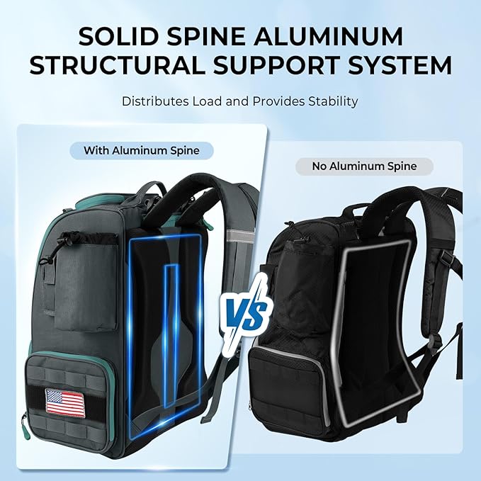 - ADVANCED BACK SUPPORT SYSTEM: Bait Boss Pro Fishing Backpack boasts an unparalleled level of comfort and support. The built-in SolidSpine Aluminum Structural Support System distributes the load and provides stability. Combined with breathable material and thick comfortable padding, this system ensures superior comfort during extended wear.