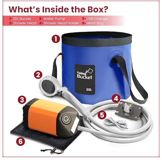 - Versatile & Convenient: Elil Portable Shower Pump is ideal for beach shower, camping showers, outdoor showers, and even pet showers. Comes with a 3-gallon collapsible bucket for a refreshing shower anywhere. Essential gear for adventurers!