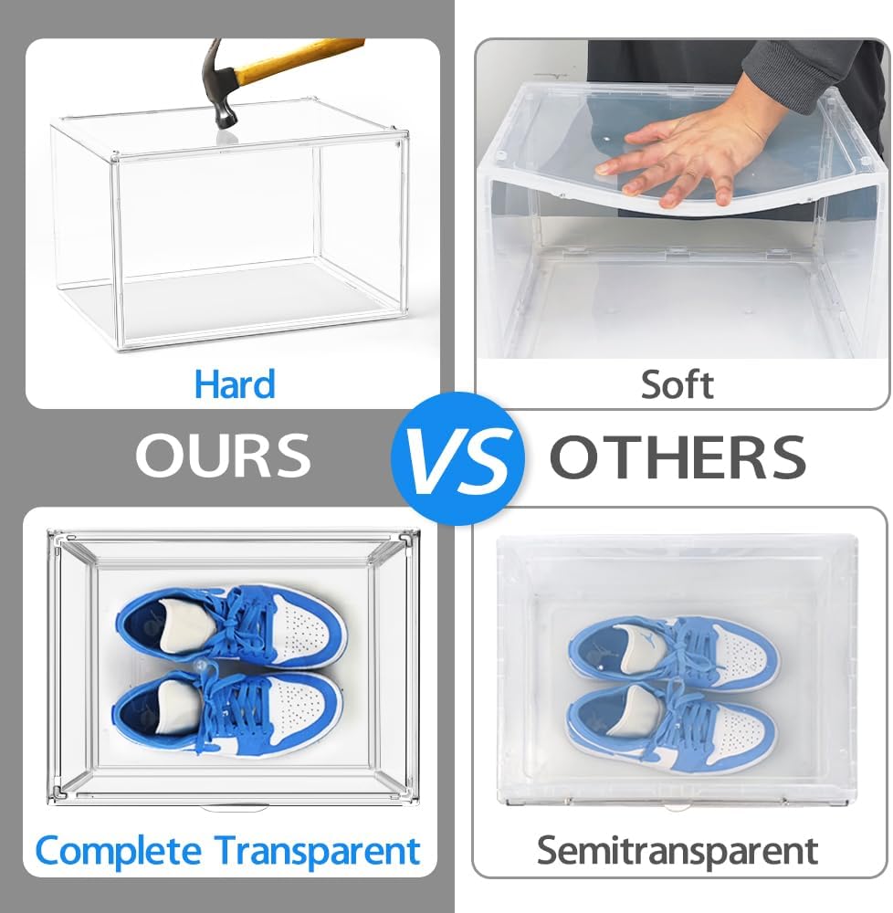 - Fit Your High-Tops: Each shoe crate measures 14.1" L x 10.6" W x 8.9" H, providing ample space for up to Men’s 15/Women’s 12 witho. The sturdy construction, made of thick high-hardness PET acrylic panels, ensures that your high-tops, sneakers, and boots are securely stored