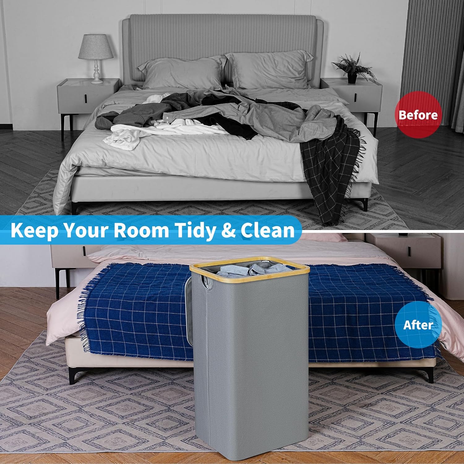 - 【Bamboo Handles and Removable Liner】The Laundry bin comes with sturdy bamboo handles for easy carrying and a removable inner bag for convenient laundry sorting and machine washing. The bamboo handles offer a natural, eco-friendly touch, while the liner simplifies the laundry process, keeping your space organized and clean.