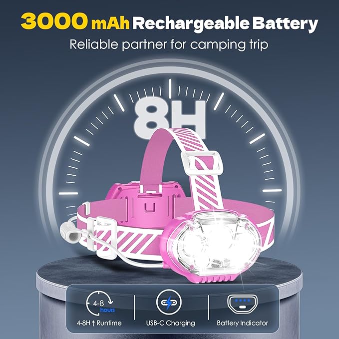 - USB Rechargeable and Long Battery Life: Do not use unsafe cylindrical batteries! Our rechargeable headlamp usa built-in rechargeable batteries to ensure your safety first. Our head lamps support Type-C USB charging, making it convenient for everyday use. The headlamp rechargeable can provide 4-8 hours of long-lasting power in different lighting modes, so you can adventure without worrying about running out of juice