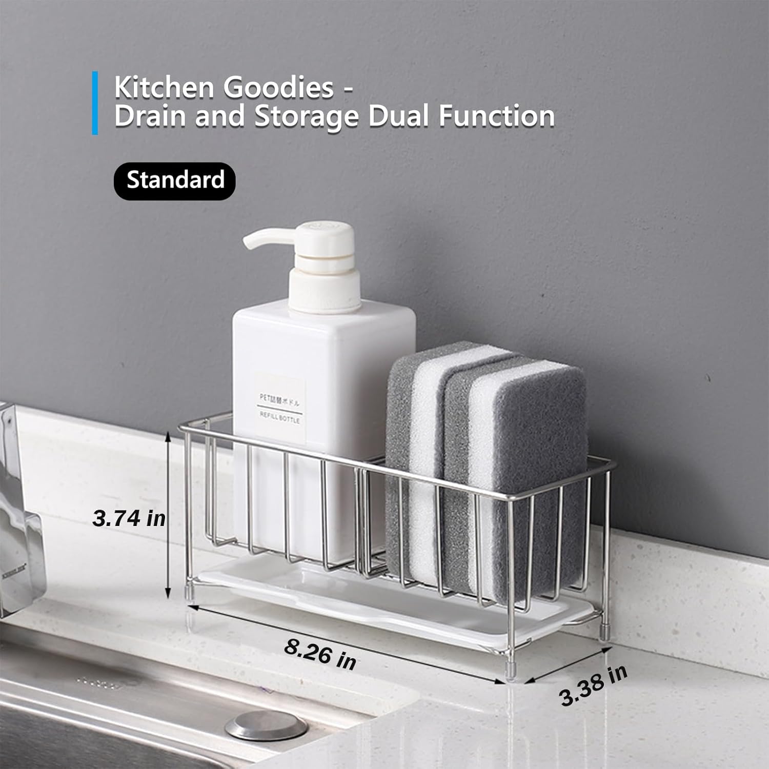 - 【Made of High-Quality Material】Kvaciva kitchen sink sponge holder is made of high-quality stainless steel, which effectively prevents rust and deformation. The bottom has a non-slip rubber pad to effectively protect the countertop from scratches. There is a 1cm gap at the bottom to prevent debris from easily accumulating. .You can easily treat countertop stains with a running faucet, making the most of your countertop space.