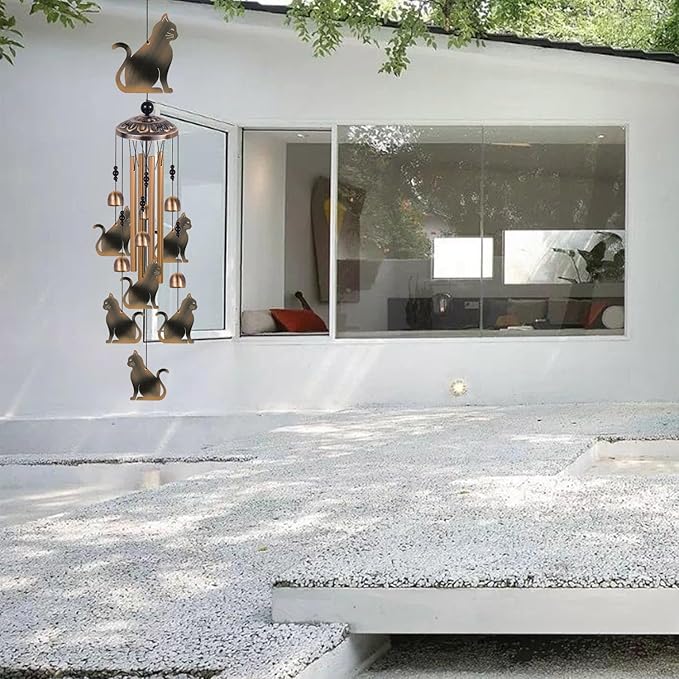 - This cat wind catcher can hang beautifully in your garden, home, patio or office, which will produces wonderful nature's crisp sound under the breeze blows. Add a rustic element to any garden with its bronze finish, bold tones and dramatic look. Eye-catching bronze wind chimes for bars, patios, garden, home, patio, indoor & outdoor decor. It will help you attract wealth and prosperity, success, and all good things.