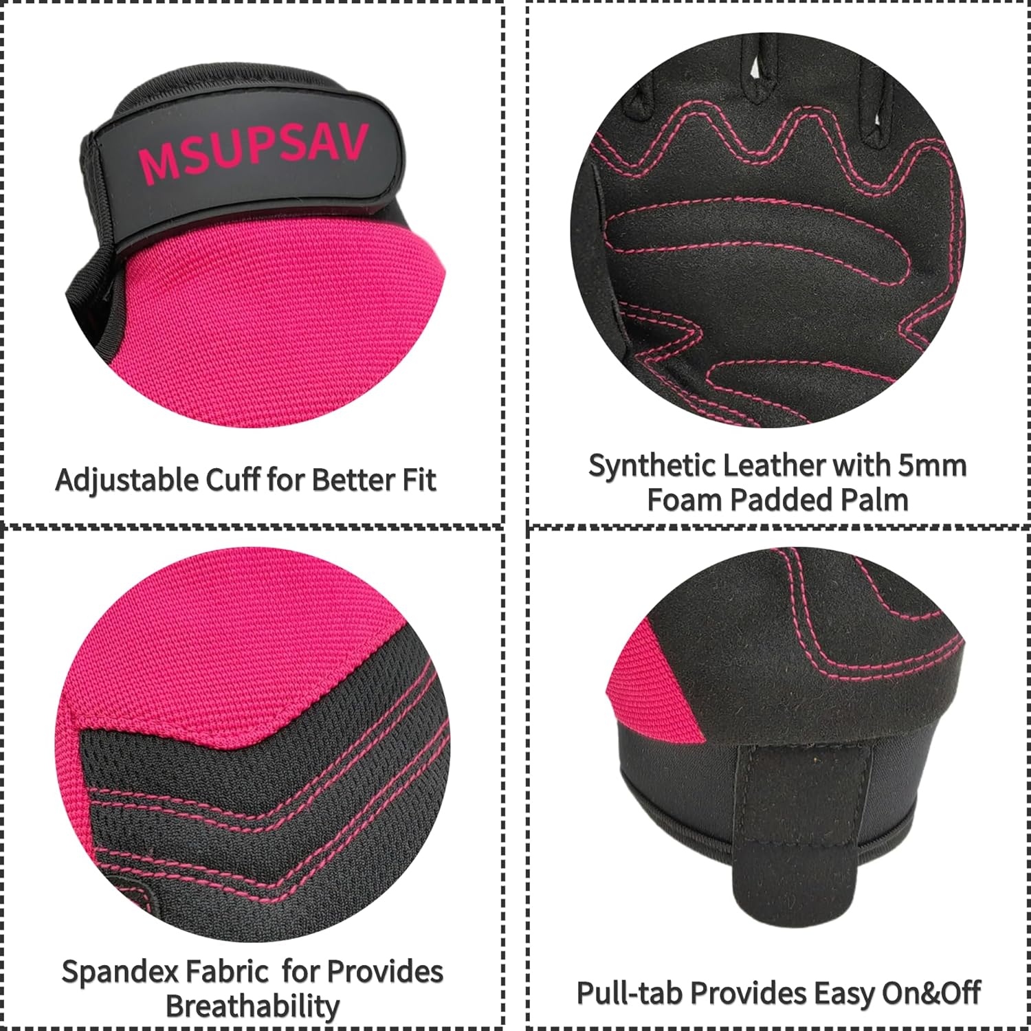 - 【MSUPSAV GARDEN GLOVES FOR GARDENING】Stretchable double-layer spandex design back keep your hands flexible,breathable&comfortable on the job. Leather with foam padded palm and reinforced fingertips increase durability.Supportive adjustable with hook& loop strips closure cuff for snug secure fit.