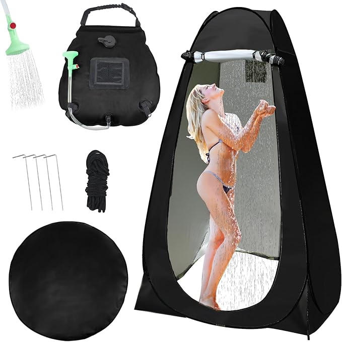 - 【Multi-Purpose】Portable privacy tent for outdoor can provide you with a clean and private space anytime, anywhere. Our portable privacy tent is fully equipped to make sufficient preparations for going out, including 1x Camping Shower Tent, 1 x Carrying Bag, 4 x Metal Mounting Stakes, 4 x Windbreak Rope, 1 x Solar Shower Bag. You can take this practical , convenient and pop up tent, for changing clothes, camping, beach, shower, toilet,hiking,taking pictures or anywhere you need privacy.