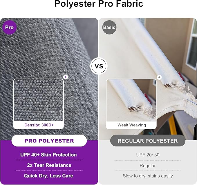- Premium Polyester Pro Canopy: Features 2X tear-resistant fabric with 3 years fade resistance, quick-drying and easy to clean. Withstands sun, rain and wind while resisting wrinkles and shrinkage for lasting durability.