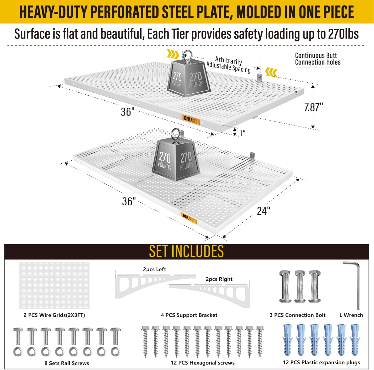 - KIT INCLUDES: Includes 2pcs of face plate; 4 Brackets; 12 Hexagonal screws (Hardened β 0.2" L/2"); 12 plastic expansion plugs, 8 Sets of rail attachment bolts; 1 L-wrench; 1 installation manual. All the hardware of Brukid professional series wall mounted shelves are under strict quality control and testing, we strive to provide our customers with a quality shopping experience, when you receive the product encountered any problems, please contact us at the first time, we will certainly give you a satisfactory solution
