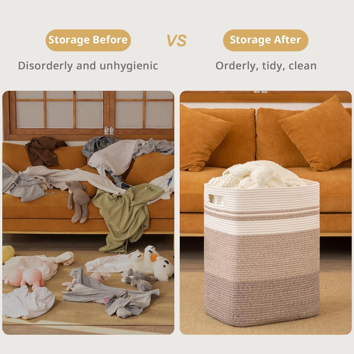 - Large Blanket Basket:The overall size of the storage basket is 16x13x22 inches.This large basket can easily accommodate a family's change of clothes and keep room clean & tidy.This elegant woven storage basket bring great convenience in life to store bulky items like blankets,toys,comforters,duvets,throw pillows,cushions,stuffed animals,winter clothing etc