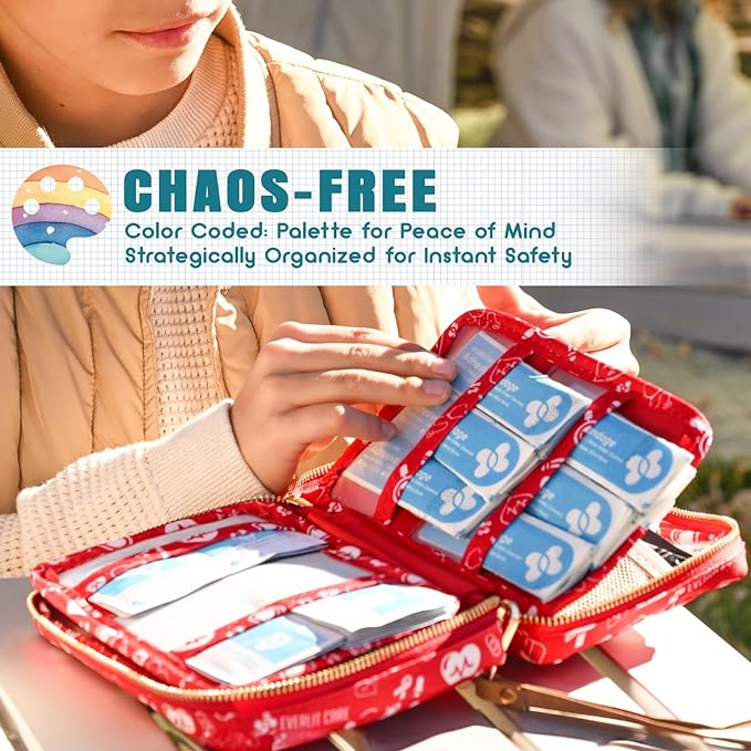 - π Travel-Friendly Organization: Our first aid kit is meticulously designed to ensure quick access during travel emergencies. Our supplies are neatly organized in designated compartments, all in one compact and portable storage bag, allowing for quick grabs during emergencies, making it perfect for parents on the go!