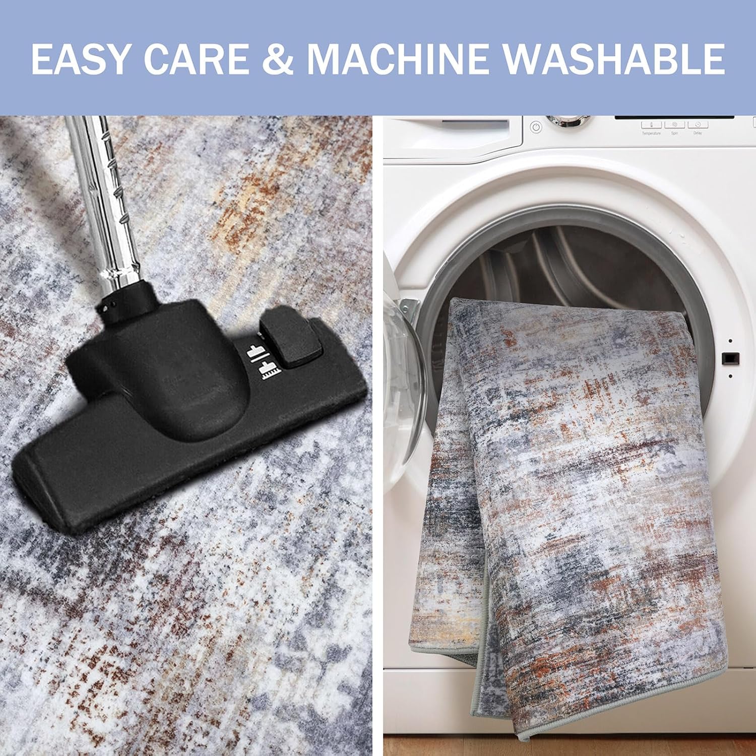 - Machine Washable: This living room rug is machine washable for easy maintenance, keeping it fresh and vibrant without the need for manual cleaning. Noted: When vacuuming, use a low setting or a robotic vacuum to prevent shifting or bunching