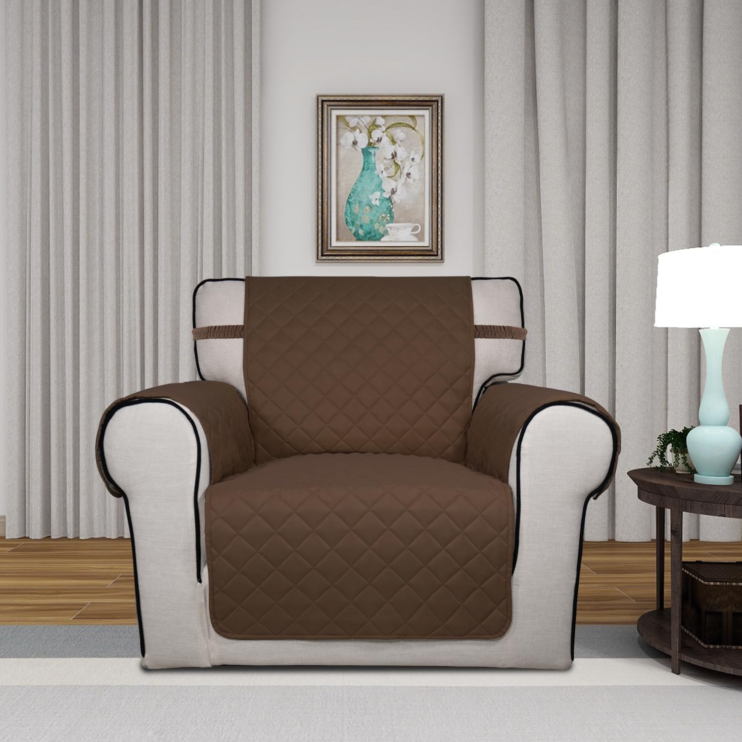 PureFit Reversible Quilted Sofa Cover, Water Resistant Slipcover Furniture Protector, Washable Couch Cover with Non Slip and Elastic Straps for Kids, Dogs, Pets (Chair, Coffee/Ivory)