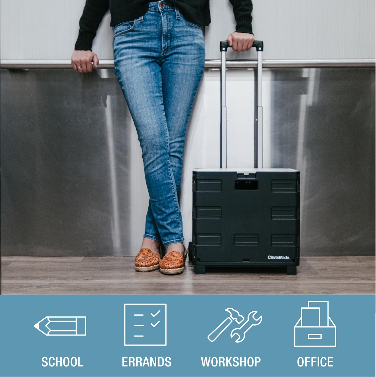 CleverMade Collapsible Wheeled Crate with Lid, 2-Wheels – Stable Rolling Crate with Handle and Large Wheels for Fragile Items, Heavy Loads and Easy Storage - 35L and 75lb Capacity, Black/Cream