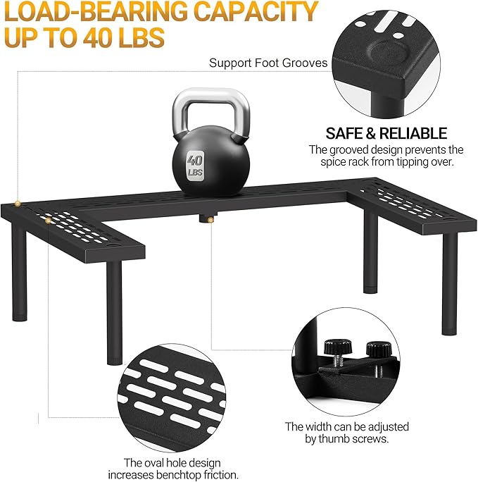 - 【Maximize Space】Expandable spice rack can improve the usage of vertical space inside the cabinet, creating more space for cupboard or pantry. Organize cluttered spices in a limited space and keep all spice bottles clearly visible, so you can find the seasoning you need quickly and easily.