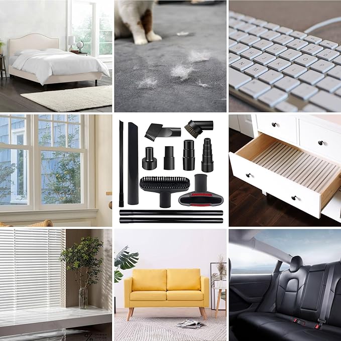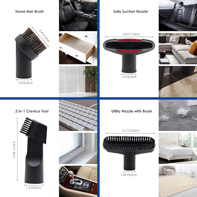 - ✅ 12 PCS VACUUM ACCESSORIES : Package includes 4×vacuum adapters, 2 × vacuum extension wand, 1×crevice tool, 1×flexible crevice, 1×sofa suction nozzle, 1×utility nozzle with brush, 1×horsehair dust brush, 1×two-in-one crevice tool