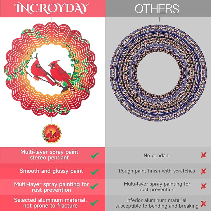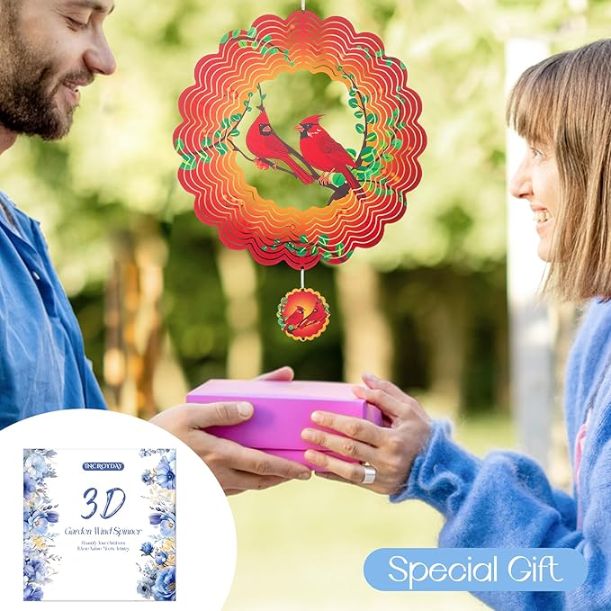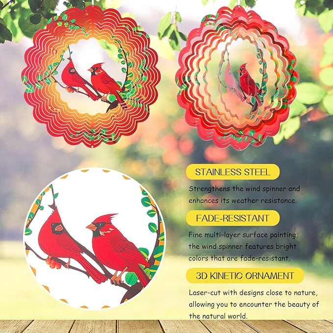 - Exquisite Artistic Design: Inspired by the elegance of cardinal, our 3D wind spinners features a vibrant and uniquely shaped cardinal design. Perfect for hanging in your yard, garden, porch, patio, or any indoor/outdoor space you desire. As the gentle breeze passes, the spinning spinner creates a mesmerizing 3D visual effect with changing light patterns, making it a distinctive addition to your garden decor