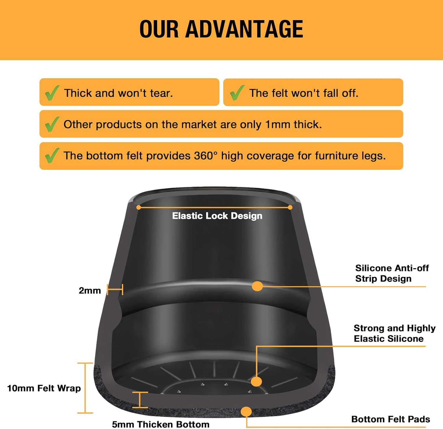 - 【Upgrade New Design】: 360° full felt pad bottom wrapped, which helps the felt bottom be able to touch the floor at any angle, preventing scratching the floor. Our chair leg floor protectors do not use gel. The bottom felt pad and the silicone chair leg floor protectors are integrated with a high-pressure machine to ensure that they will never fall off.