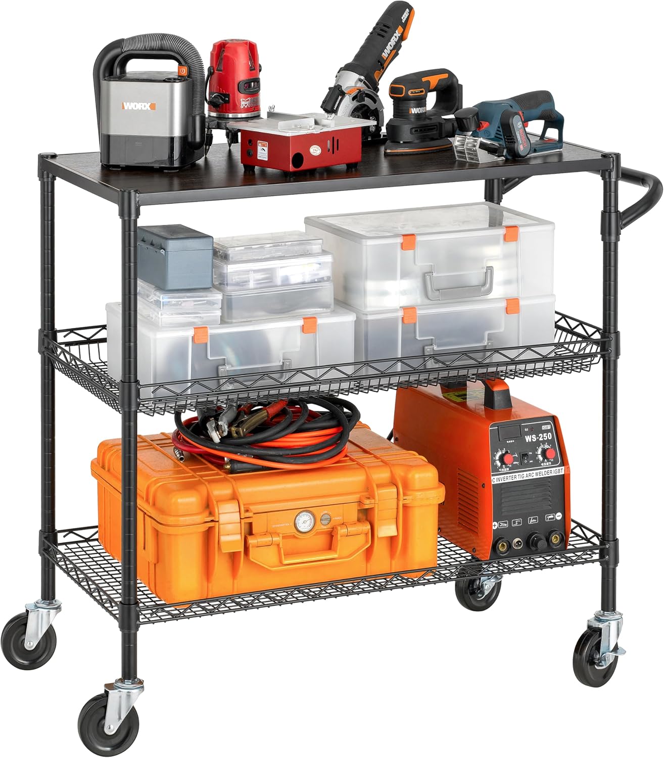 Finnhomy 3 Tier Heavy Duty Commercial Grade Utility Cart with Wood Top, Wire Rolling Cart with Wheels and Handle Bar, Kitchen Carts on Wheels, 18x36x35.4 H Metal Cart with 600 LBS Capacity, Black
