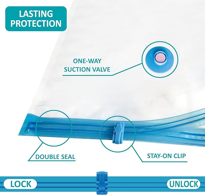 - Reliable protection: With the triple-seal turbo valve & double-zip seal design, our vacuum bags get the air out in the suction process; Can be used repeatedly