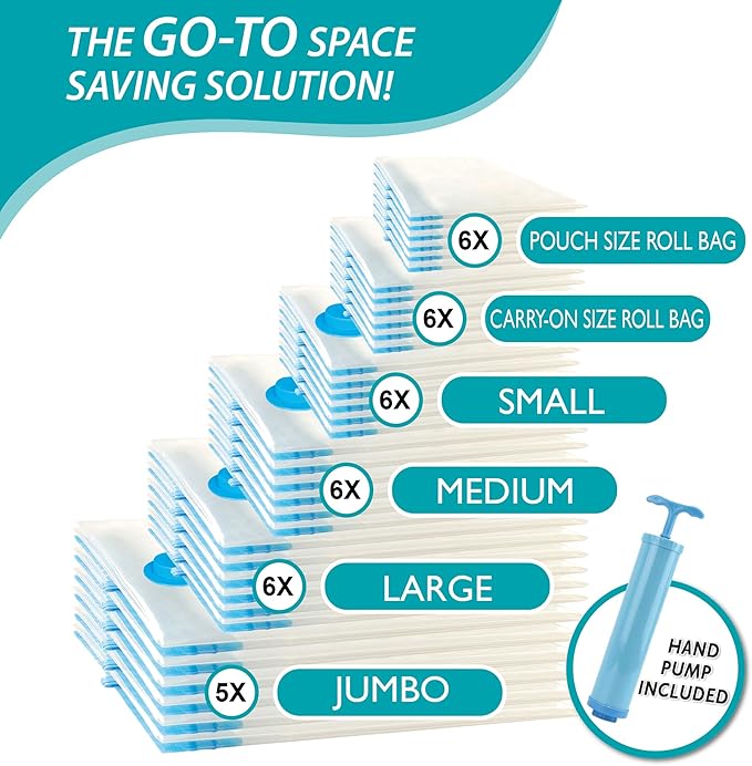 35 Pack Space Saver Bags (5 Jumbo/6 Large/6 Medium/6 Small/6 Roll-M/6 Roll-S) Compression Storage Bags for Comforters and Blankets, Vacuum Sealer Bags for Clothes Storage, Hand Pump Included