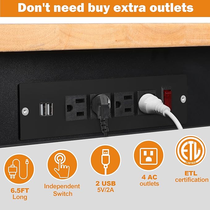 - 【4 AC 2 USB Power Outlets】 The ETL certified power strip has 4 AC Outlets, 2 USB Ports and 1 Switch, with 6.5 ft long Wire, which is safe and durable, making it easy to equip the worktable with various electric tools and lights