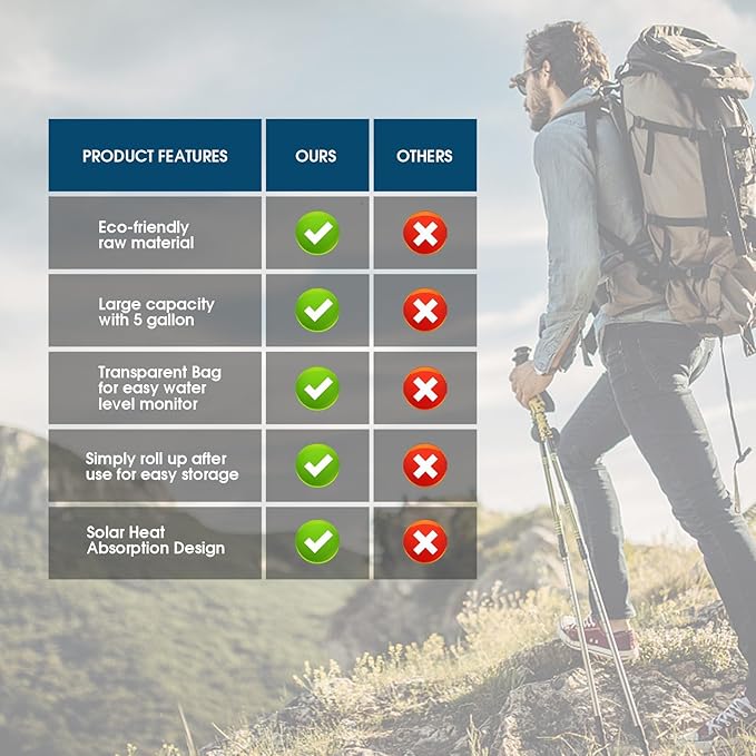 - Large Capacity: The camp shower bag has Larger water capacity of 5 gallons/20 L, the solar shower bag is enough for about 3 showers.the fill-in and fill-out outlets are especially enlarged which means you do no need to spend too much time while filling the water into the camping shower bag,and will enjoy shower camping experience without hassle