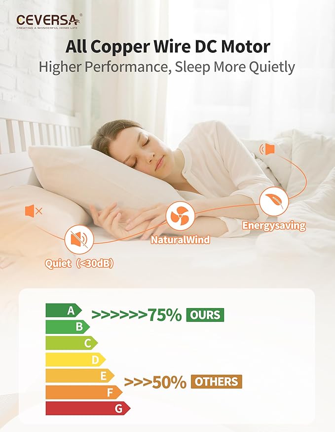- 【Noiseless Reversible DC Motor】Ceversa ceiling fan with light use solid copper wires, which have superior conductivity compared to traditional AC motors. This enhances motor efficiency by over 50%, significantly reducing energy consumption and saving on electricity bills. With noise levels below 30 decibels, our motors are designed to last for over 15 years.