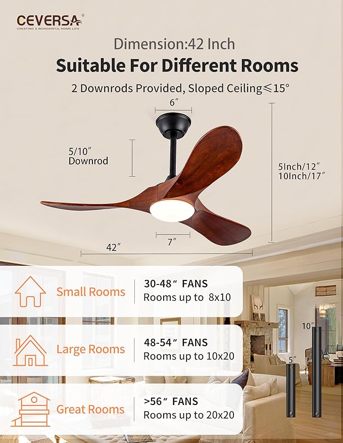 - 【Easy installation】Ceversa ceiling fan is the perfect combination of modern and technology. It comes with both 5‘’ and 10'' downrods, come with detailed instructions and install video to help you easily install it. Any installation problems pls contact Ceversa.The propeller design style is versatile,suitable for farmhouse,rustic,living room,bedroom and so on.
