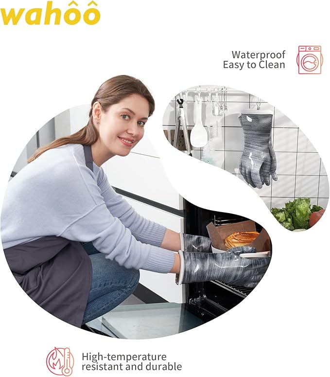 - High Temperature Resistant - wahoo heat resistant gloves are capable of withstanding temperatures ranging from -100°F to 480°F for an extended time and up to 600°F of no more than a few seconds. And the surface of it is waterproof. The gloves are odorless, stain-resistant and impervious to grease, easy to clean, wash with mild dish detergent in hot water.