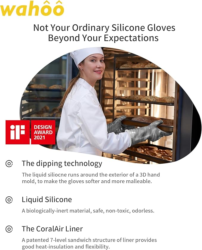 - Next Level Performance - wahoo silicone oven mitts for hand protection are tested in accordance with EN 388:2016+A1:2018, EN 511: 2006 contact cold, EN407:2004 contact heat, and meet CA Prop.65 regulations for phthalates. We offer different sizes medium, large, xl, xxl.