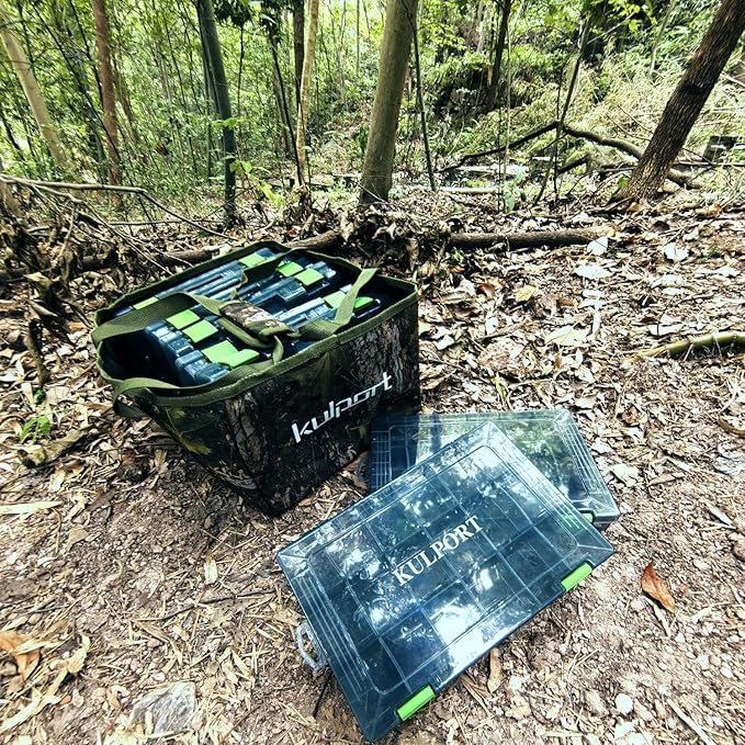 - The Kulport tackle bag is perfect for transporting a variety of fishing gear. The open design allows you to easily see all the boxes and accessories in your bag at a glance, making it easier to find and retrieve. The huge capacity can accommodate all the boxes and accessories you need for outdoor fishing and hunting, with dimensions up to 14.1IN * 11.8IN * 7.8IN