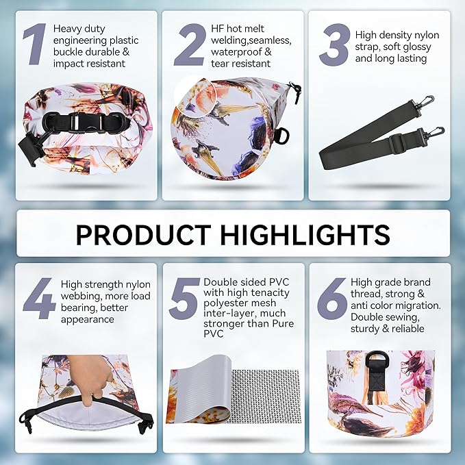 - Floatable and Trackable: The dry sack can float on water without sinking after being rolled up and buckled, so you can quickly track and retrieve your stuff. The D-ring and strap on the bag make it easy to attach to the boat, keeping your stuff always with you without getting lost, allowing you to enjoy thrilling outdoor activities with peace of mind.