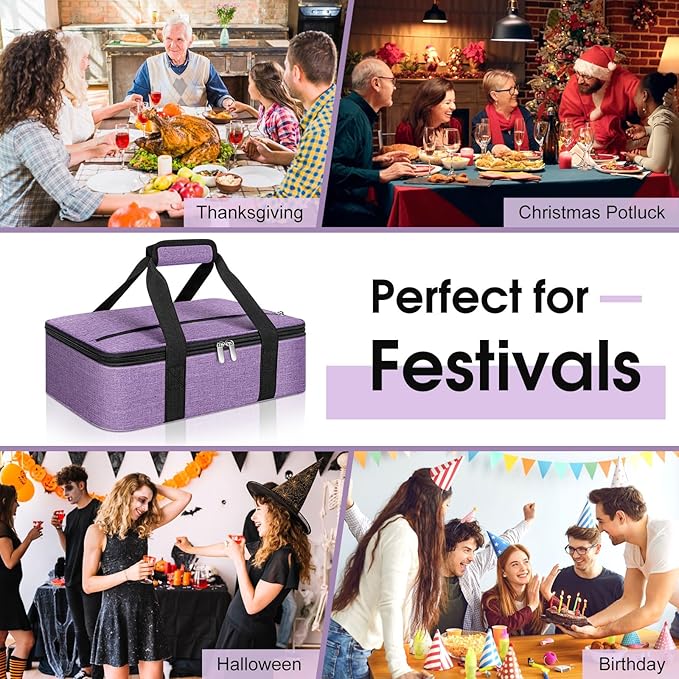 Insulated Casserole Carrier, Portable Casserole Carrier for Hot or Cold Food Lunch Tote Warmer or Cooler Bag, Lasagna Lunch Bag for Potluck Parties- Fits 9" x 13" Baking Dish-Purple