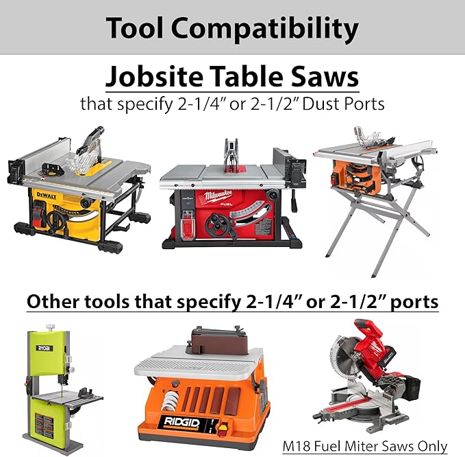 - Compatible with most dust ports described as 2-1/4" or 2-1/2" on table saws, bandsaws, sanders, bench-top jointers, and more