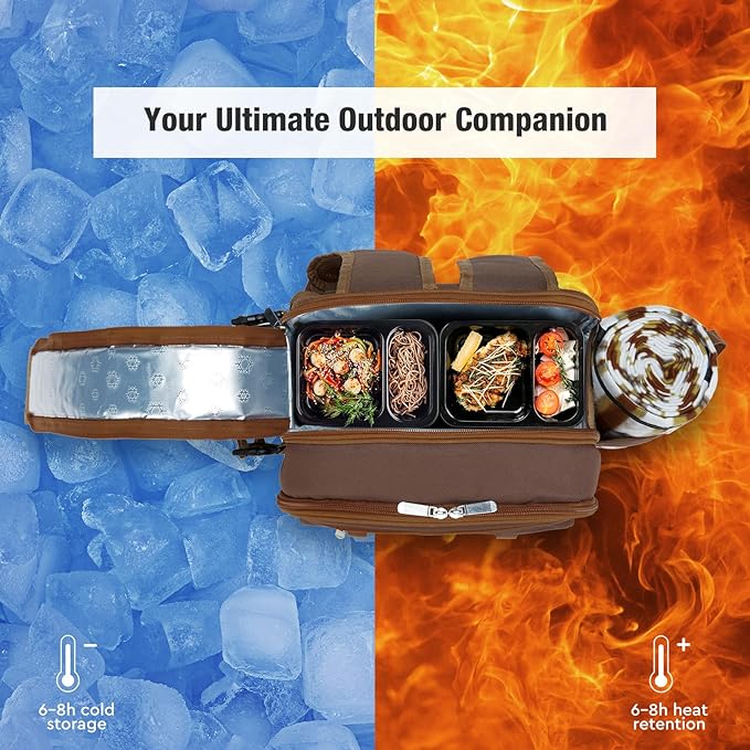 - LARGE CAPACITY & WELL EQUIPPED: Size: 12(L)x7.5(W)x16(H) inches, 5.3 lb; The 24L high-capacity picnic backpack big enough to accommodate the ingredients needed for a picnic. Includes a full set of meal preparation tools, thickened waterproof picnic mat, wine bag, and we exclusive gift internal detachable waterproof preservation layer. The bag is made of 600D Oxford fabric and 5mm PE foam and PU layer, which can keep the hot/cold/fresh for hours.