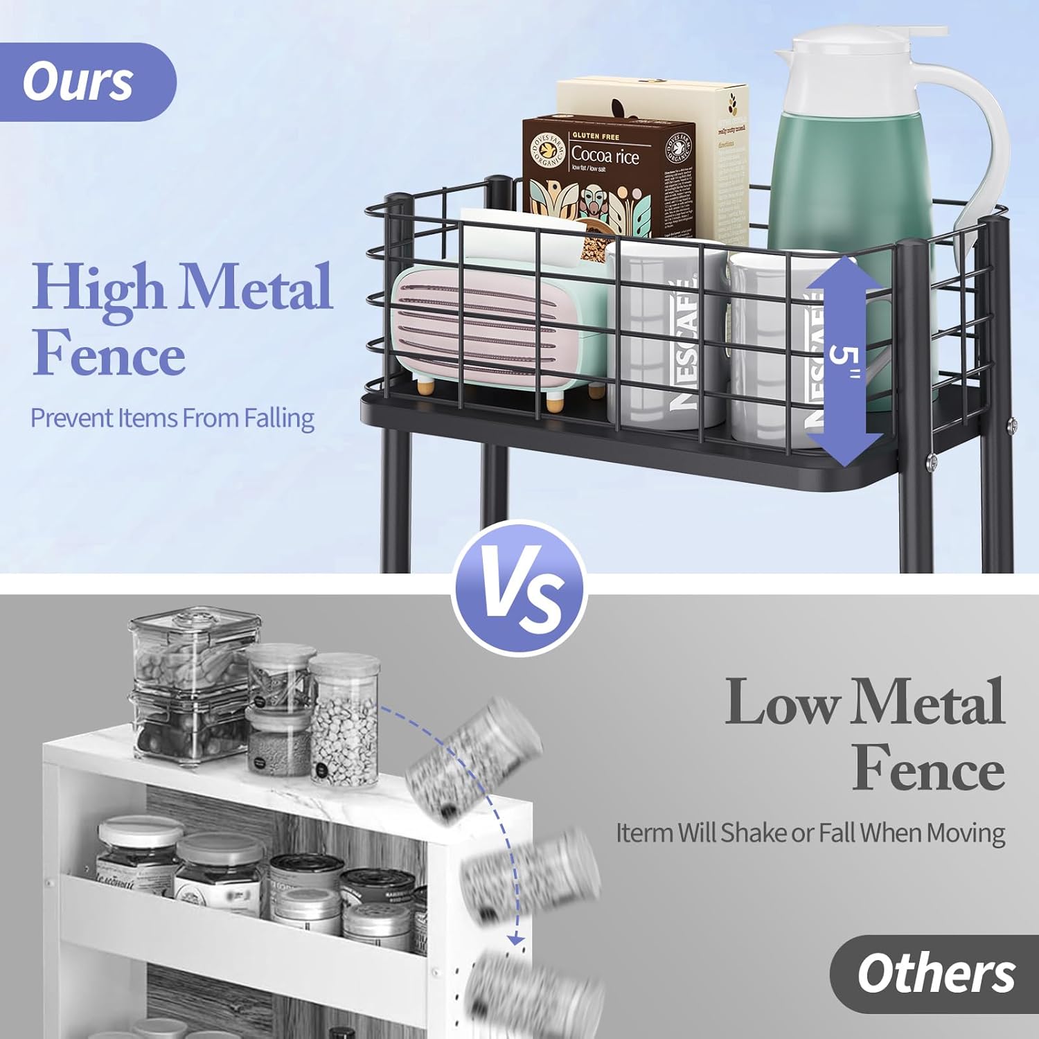 - 【HIGH MESH GUARDRAIL Design】The rolling cart features a high mesh design, providing added height to prevent items from falling off. This utility cart ensures secure storage for all your items. You can display your photos on top of the mesh to add fun to daily life.You can discover more storage solutions and interesting ideas in the process of using this cart.